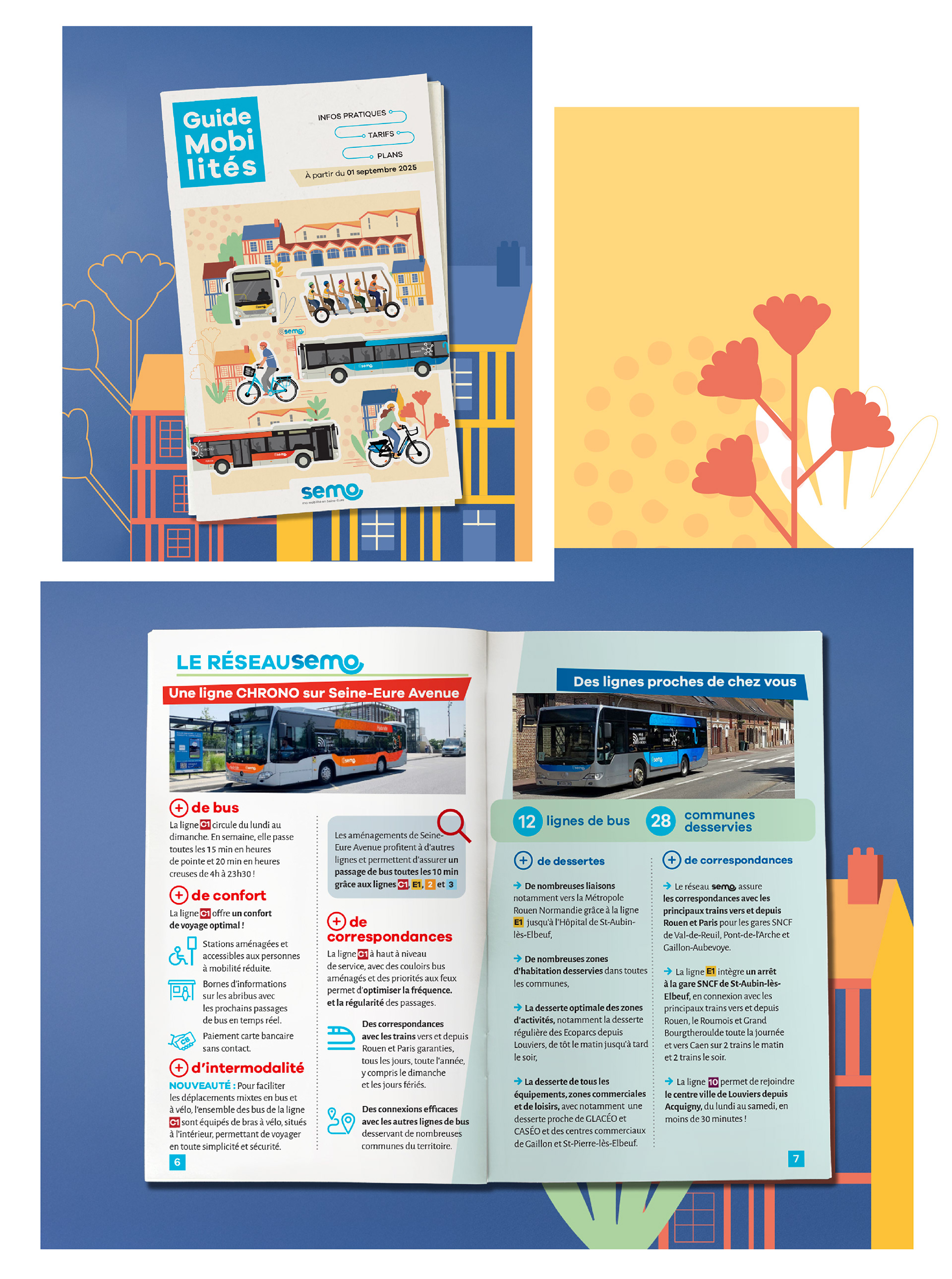 Mise en page du Guide Mobilités 2025/2026 pour le réseau urbain semo.